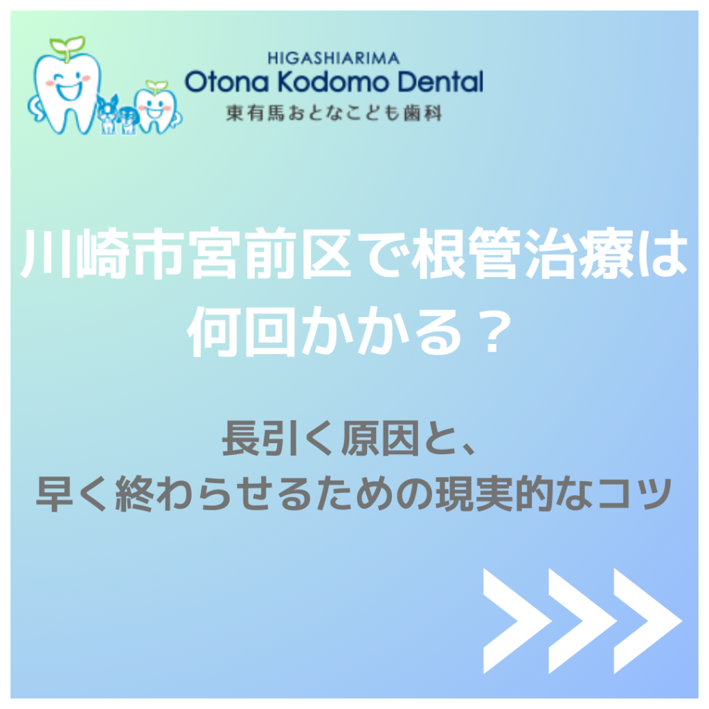 川崎市宮前区(鷺沼・東有馬周辺)で「根の治療が長いと言われた」「何回通うのか不安」という方に向けて、根管治療の回数の目安と、長引く理由、早く終わらせるためにできることを整理します。